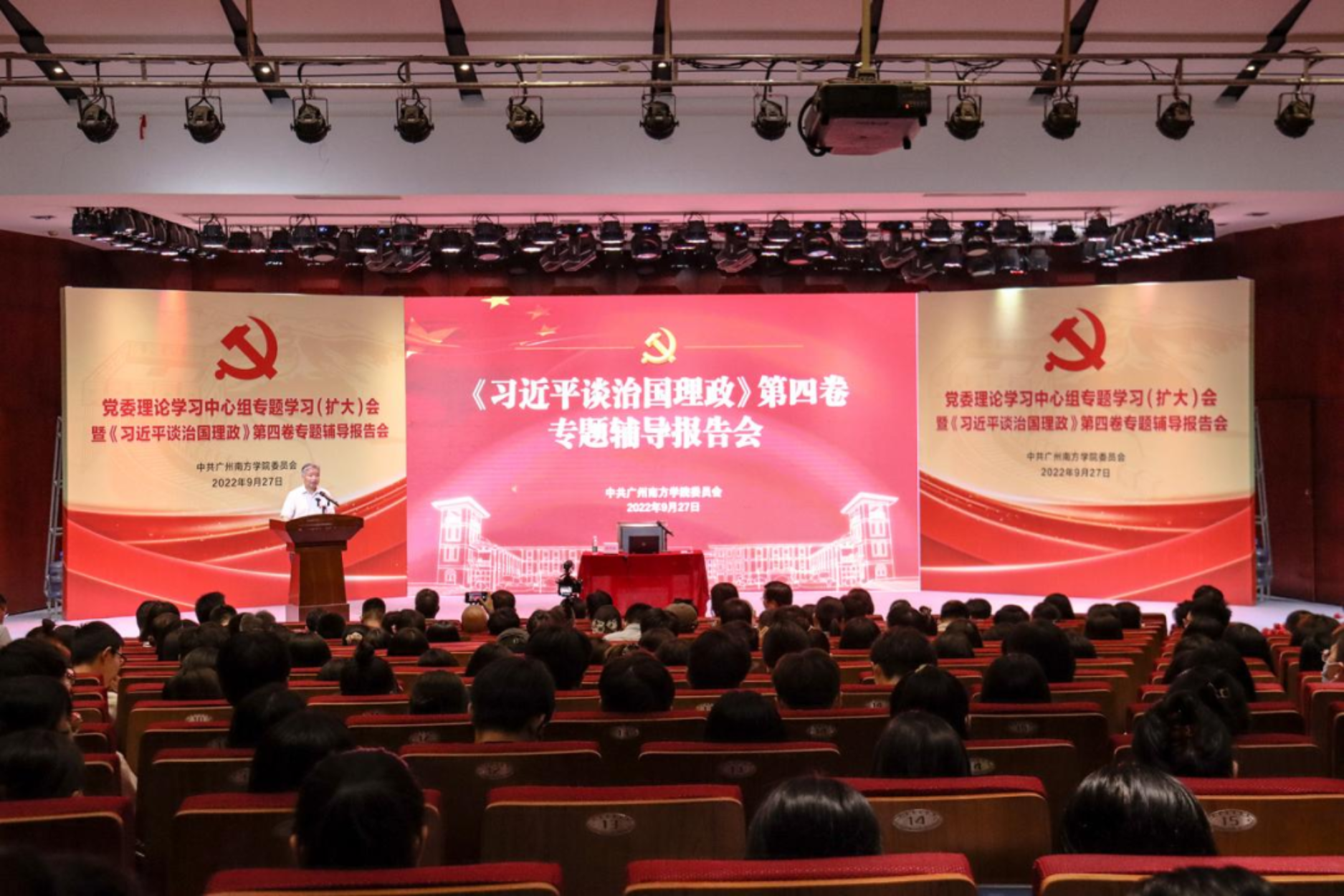 9月27日下午,我校在音乐厅召开党委理论学习中心组(扩大)专题学习会暨《习近平谈治国理政》第四卷专题辅导报告会。会议特邀省委宣传部《习近平谈治国理政》第四卷宣讲专家、中山大学马克思主义学院教授胡雪莲作专题辅导报告。学校党政班子成员、校长助理、校党委理论学习中心组成员、马克思主义学院教师及党员师生代表共400多人参加本次报告会,会议由党委书记李建超主持。