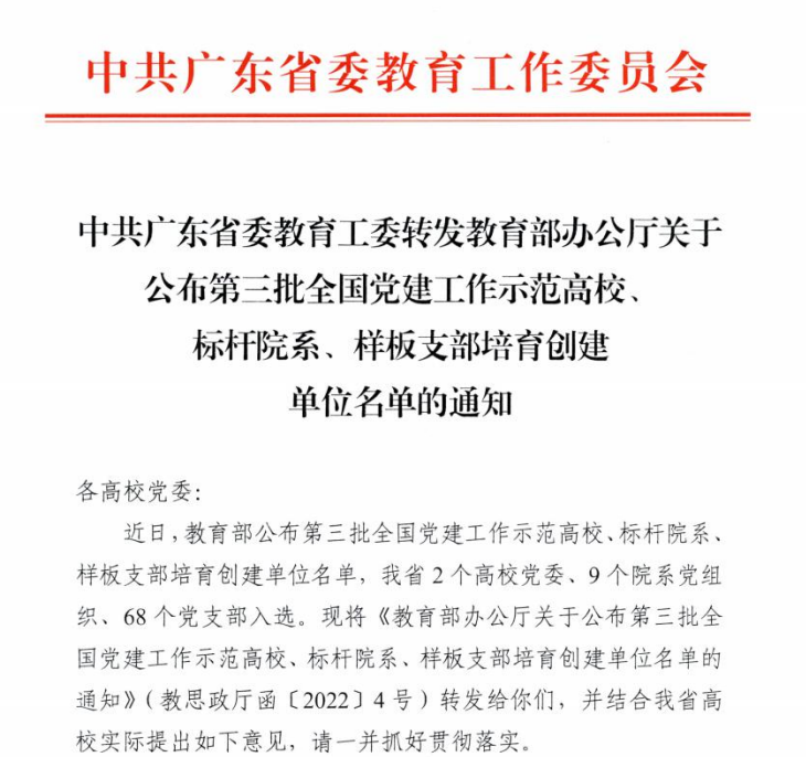 近日,教育部公布第三批全国党建工作示范高校、标杆院系、样板支部培育创建单位名单,广东省2个高校党委、9个院系党组织、68个党支部入选。其中,我校商学院学生第四党支部入选第三批“全国党建工作样板支部”培育创建单位,是校党建“双创”工作开展以来,首次入选全国样板党支部培育创建单位。