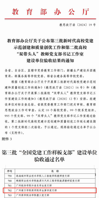 近日,教育部思想政治工作司公布第三批新时代高校党建示范创建和质量创优工作和第二批高校“双带头人”教师党支部书记工作室建设单位验收结果。我校商学院学生第四党支部作为第三批“全国党建工作样板支部”建设单位,通过开展一系列创新举措和实践活动,实现了预期目标,取得了显著成效,顺利通过教育部的验收。