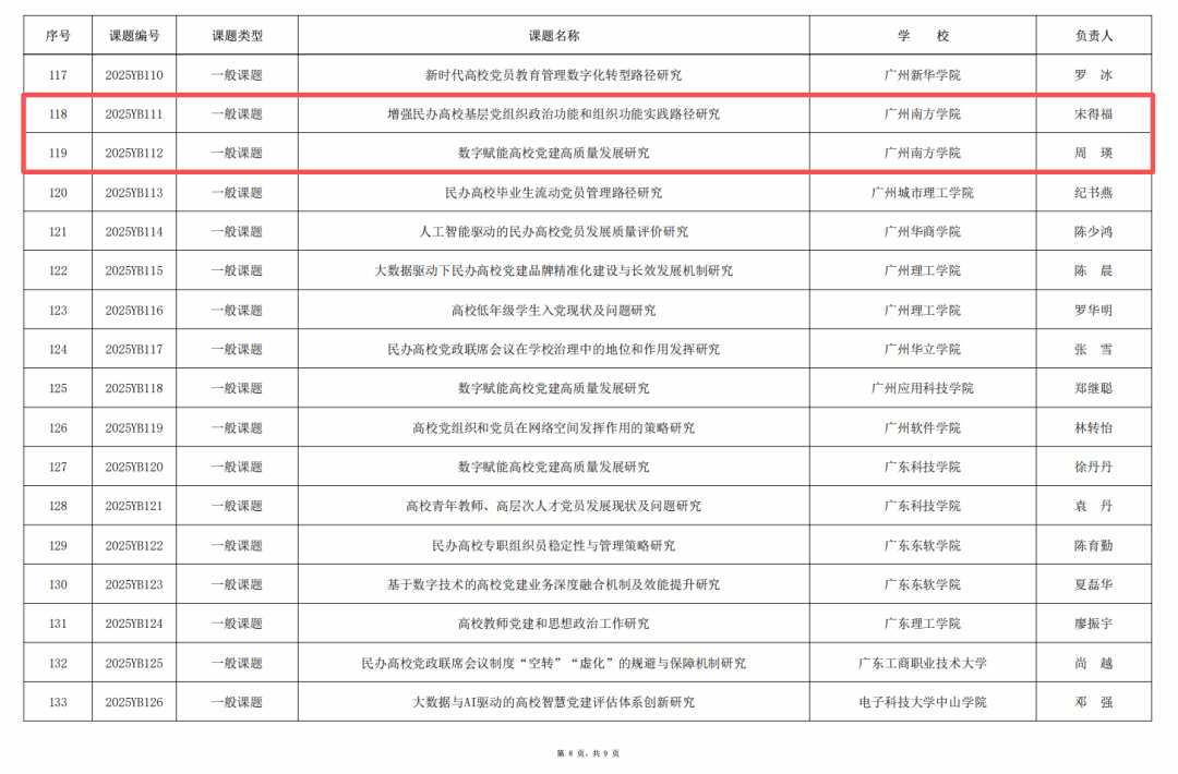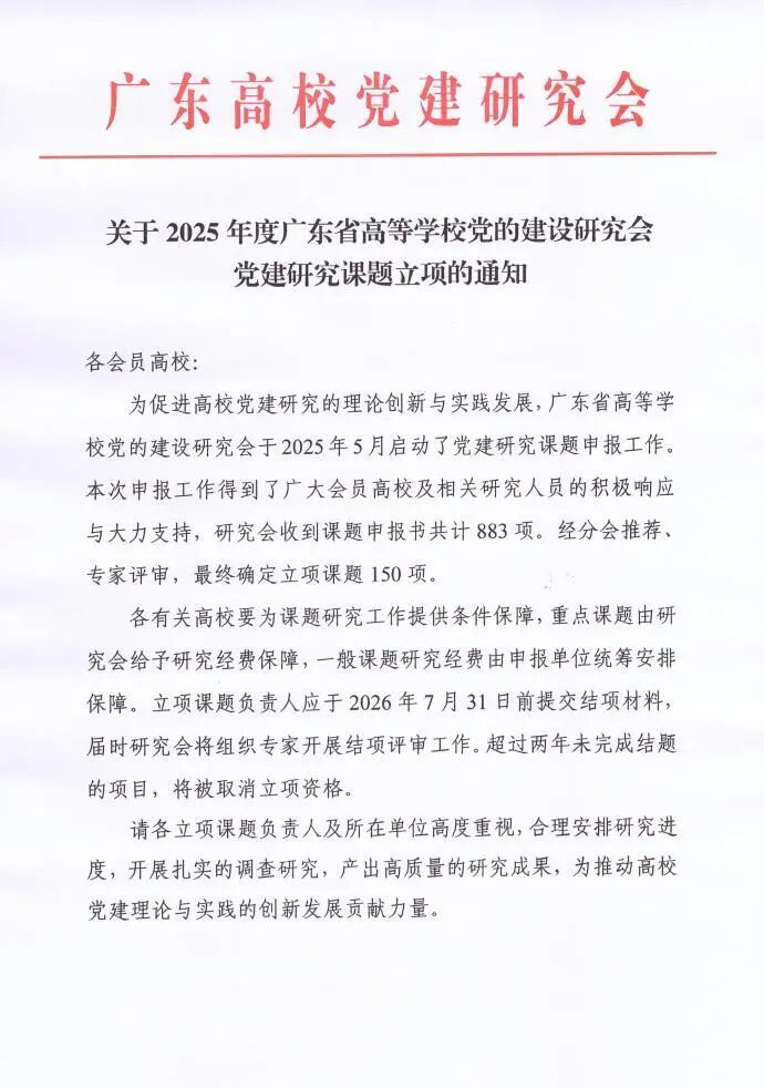 近日,广东省高等学校党的建设研究会公布了2025年党建研究课题立项名单,我校党建研究课题立项共2项。